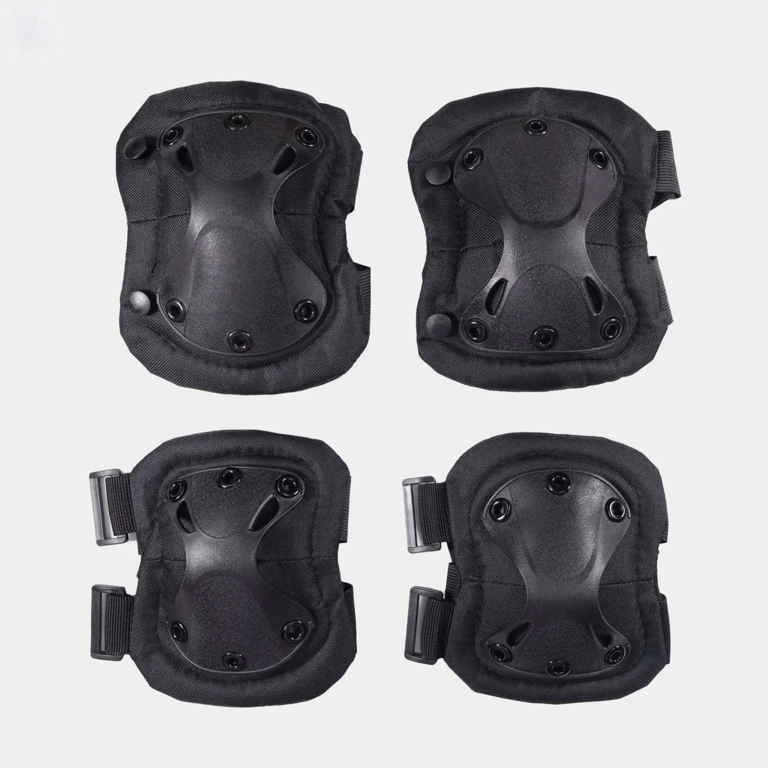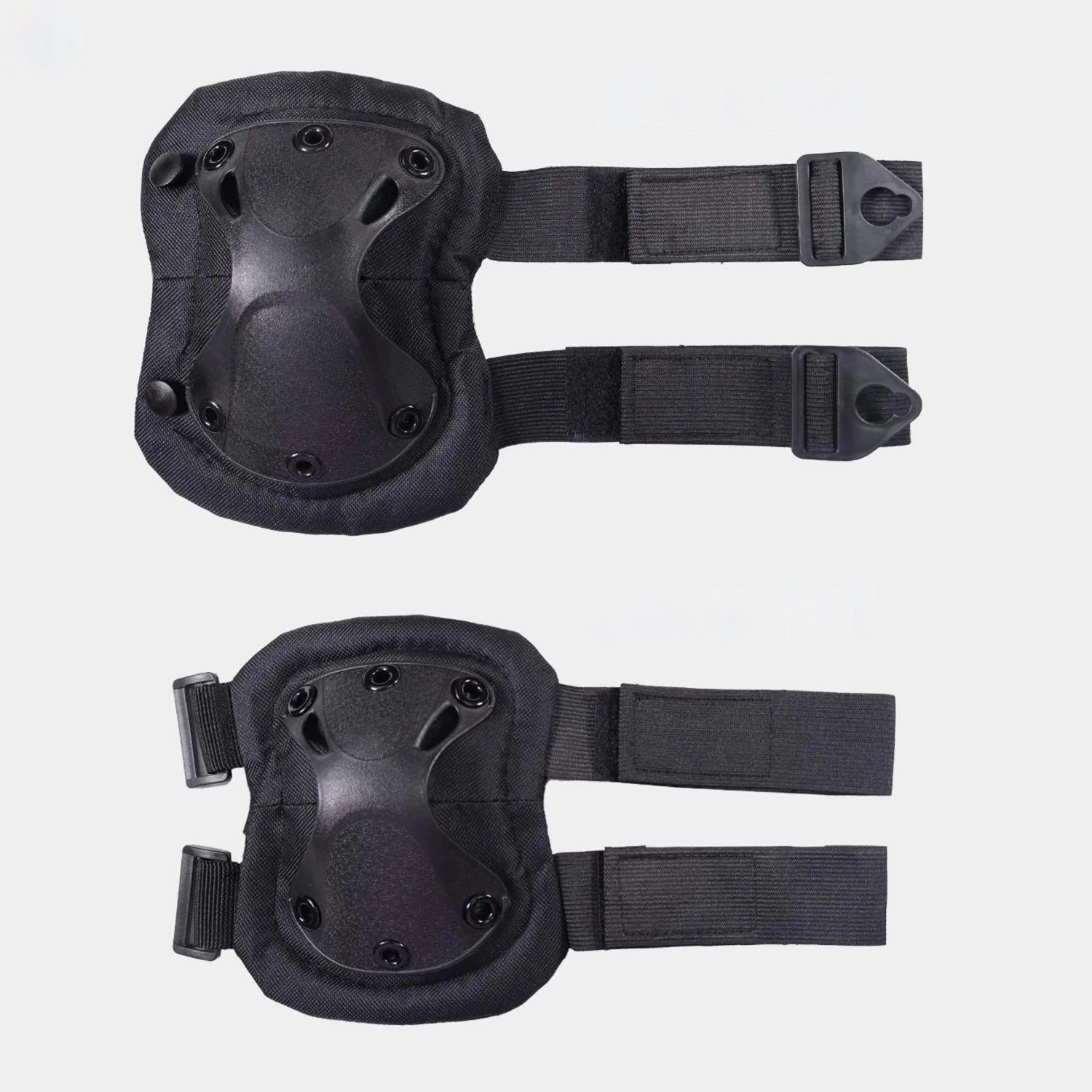 This Tactical Knee and Elbow Guard Set in black features a heavy-duty design with a hard shell outer layer to provide robust protection. Adjustable elastic straps ensure a secure, comfortable fit tailored to your movement. Built with shock-absorbent padding, it offers enhanced safety during tactical training, airsoft, biking, and various outdoor activities, giving you confidence and reliable defense in demanding environments.